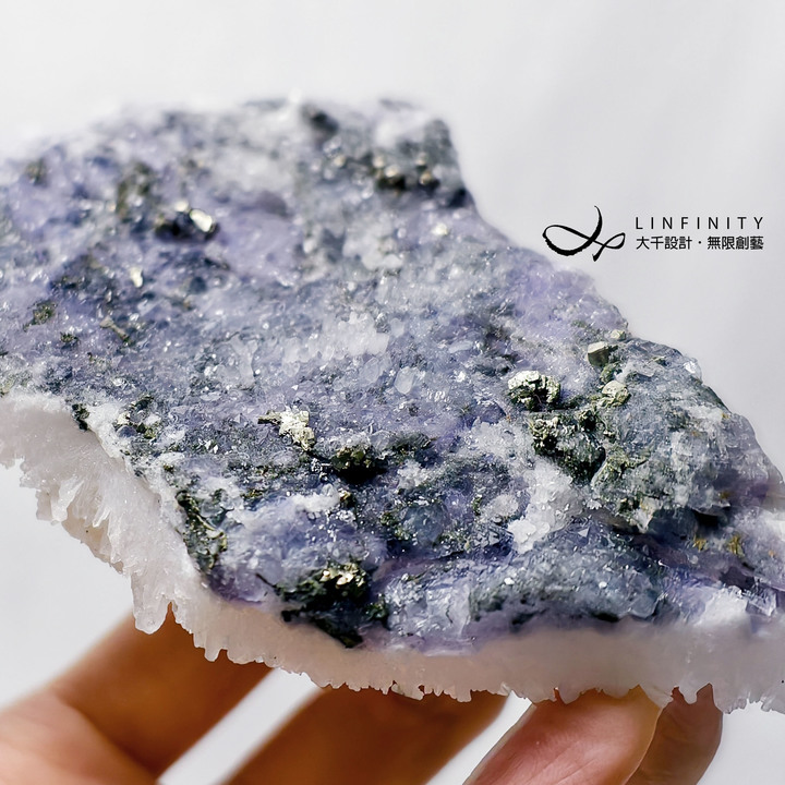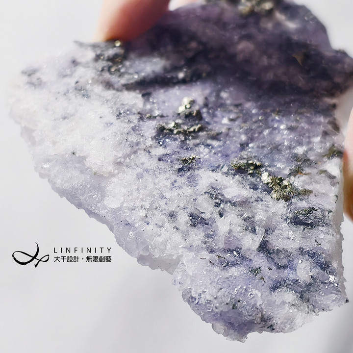 原礦擺件的一側,是滿滿細膩的紫水晶為底,黃鐵礦閃耀其中。