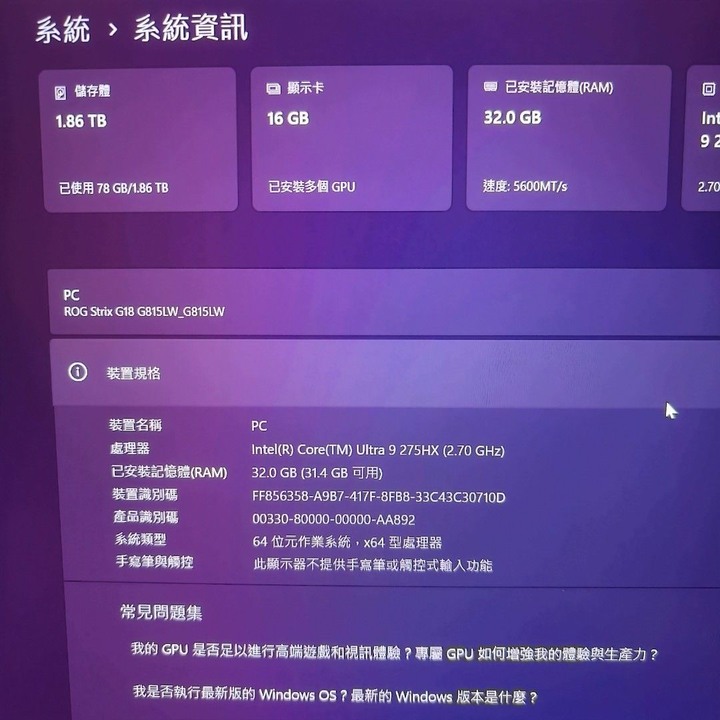 ASUS ROG Strix G18 特仕版(Ultra 9 275HX/RTX 5080-16G/32G/2TB/W11/G815LW-0031G275HX-NBL)18吋電競筆電黑色