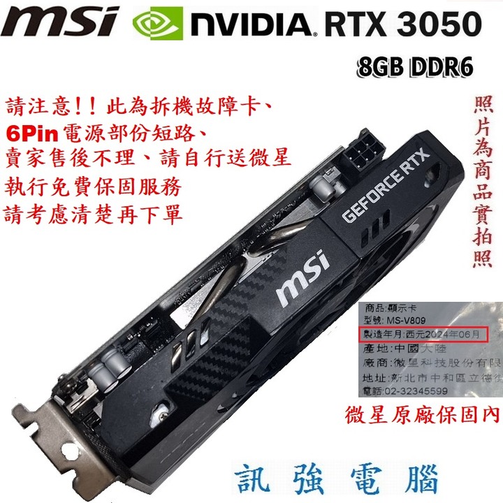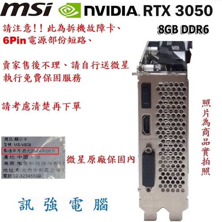 此為故障卡、NVIDIA-RTX3050/8GB、原廠保內、6Pin電源短路、需買家自行送保或維修、售後不理、接受再下單
