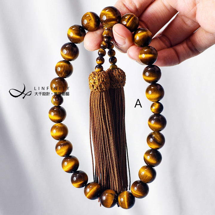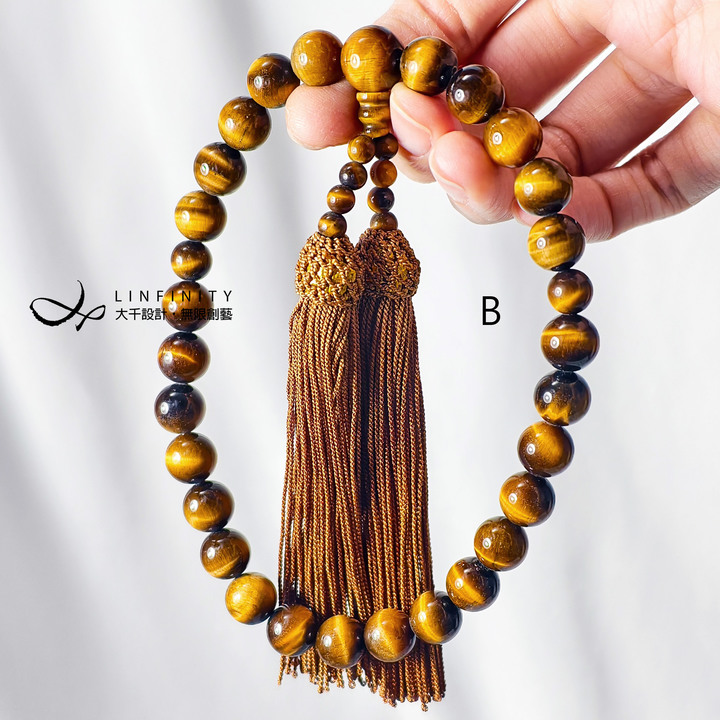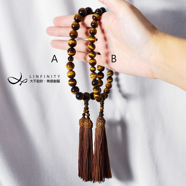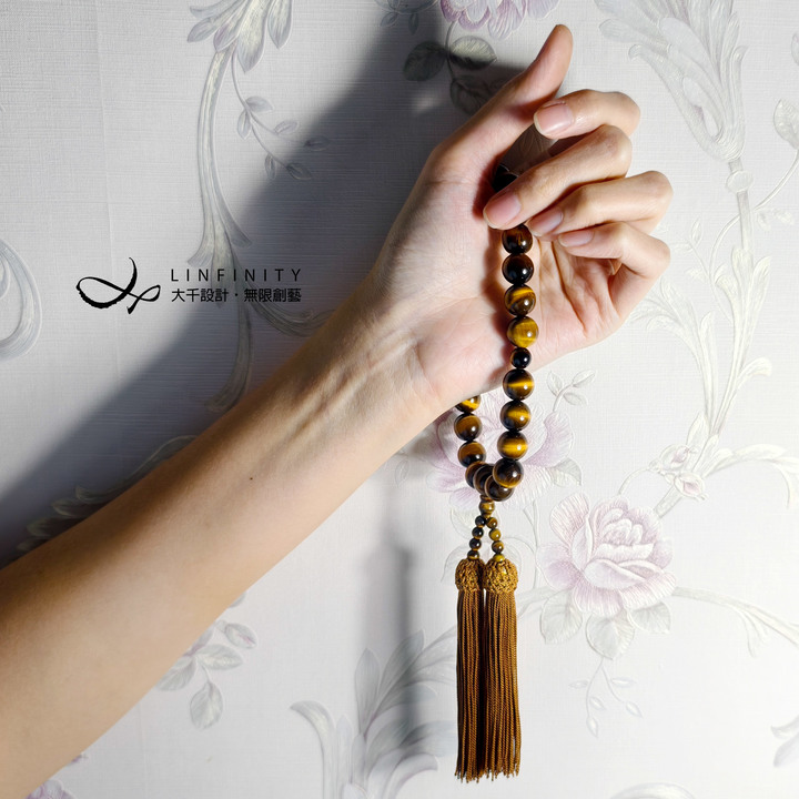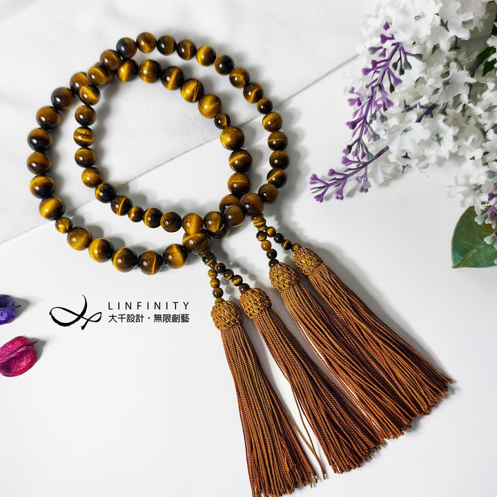 遵循日本傳統日本念珠(數珠 じゅず)端正而莊雅的造型語彙,嚴選天然頂級虎眼石(招財、智慧)搭配茶褐色絹製流蘇,細緻展現台灣工藝美學 × 日本禮儀文化的和諧融合,並承載台日友好的深厚底蘊。