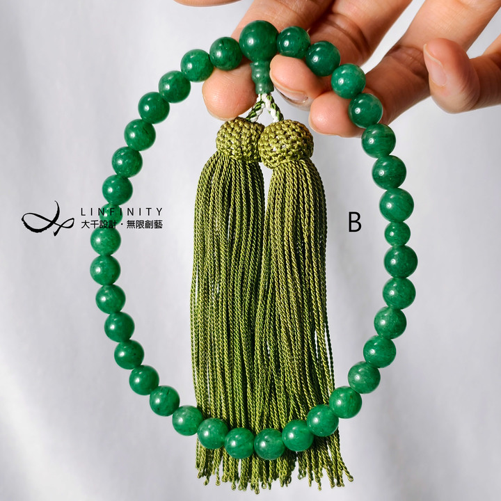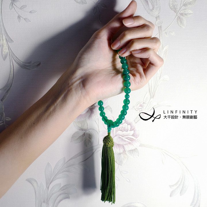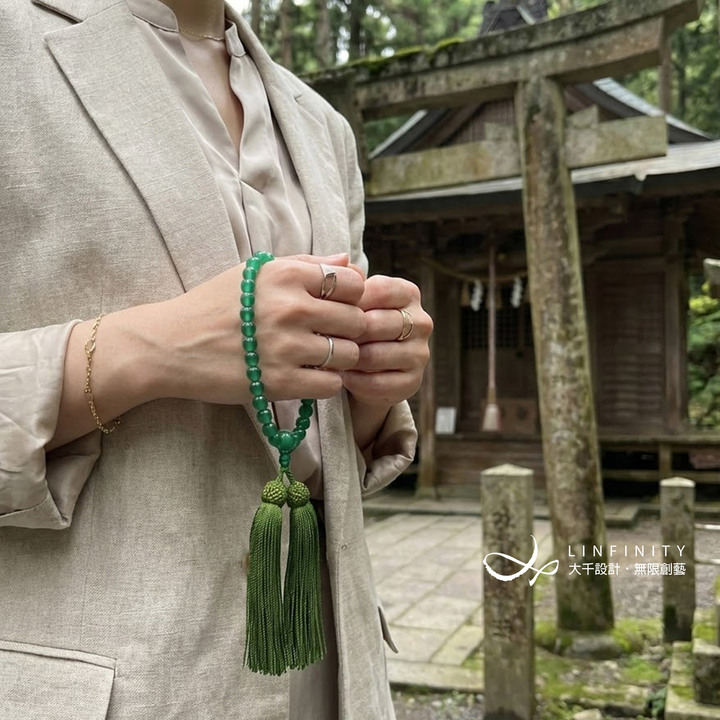 遵循日本傳統日本念珠(數珠 じゅず)端正而莊雅的造型語彙,嚴選2款綠色寶石 - 綠瑪瑙、東菱玉(對應心輪,幫助思考、助事業、招財富)搭配竹青綠色絹製流蘇,細緻展現台灣工藝美學 × 日本禮儀文化的和諧融合,並承載台日友好的深厚底蘊。