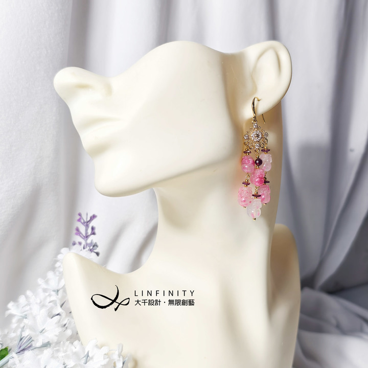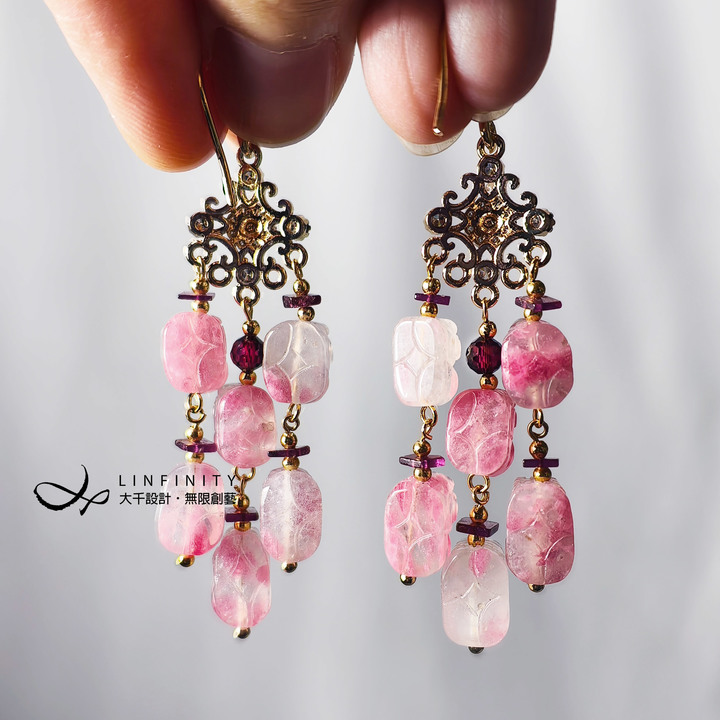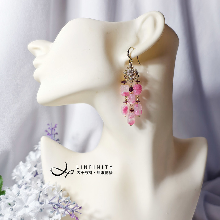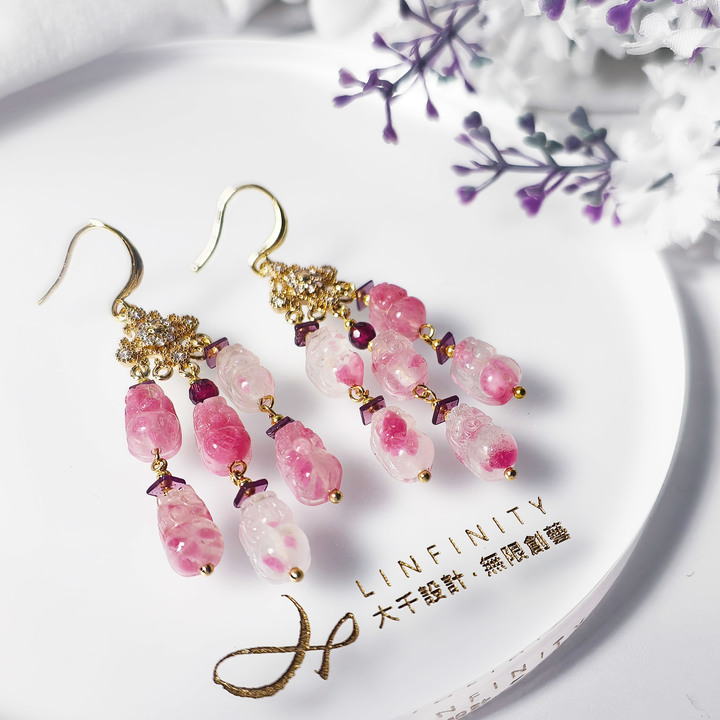 材質:天然薔薇輝石(玫瑰石、櫻花雨)、紅石榴(紫牙烏)、18K金、925銀