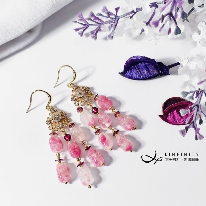 紅石榴石為頂級品種,紅艷、無黑點。磨製閃耀鑽面球、切片,與櫻花雨貔貅設計為流蘇飾,於動靜之間折射深邃紅艷光澤,為整體注入華麗層次與靈動氣韻。