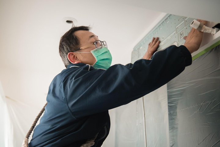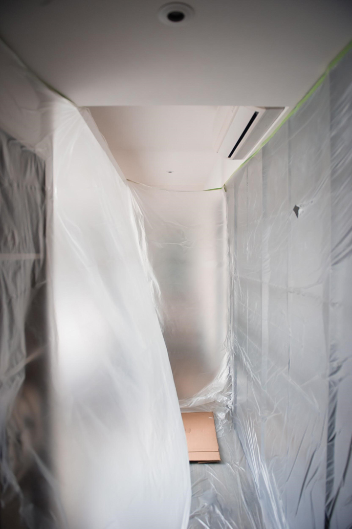 ↑ 當施工人員將機器細心搬入後(還在疫情期間配戴口罩真的很令人安心),便先將預計安裝空間都鋪設上防塵塑膠袋,這也讓已經完成裝潢的裝機客人超安心啊!這也讓後續的拆舊機、鎖螺絲等施工都不會弄髒現有的空間。
