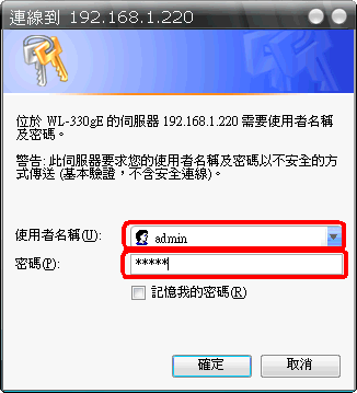 輸入 WL-330gE 的帳號及密碼(兩個預設值都是 admin,若改過設定就要你回想看看了)