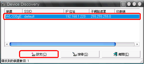 NB 連上後先利用 WL-330gE 光碟裡的工具程式「Device Discovery」找出設定頁面的網頁位址。