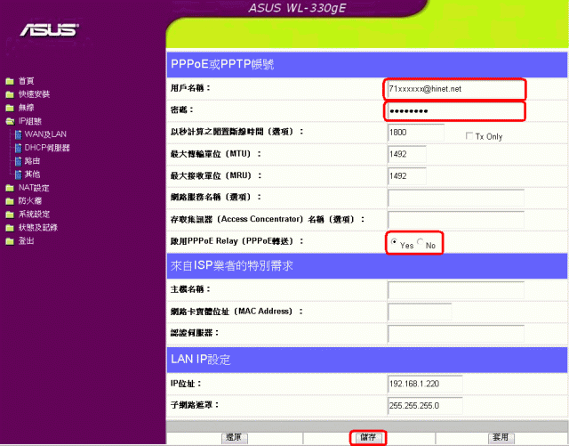「啟用PPPoE Relay」可選 Yes,這樣你就算仍在 NB 連上後,不小心又用了撥號程式去連線也可通。