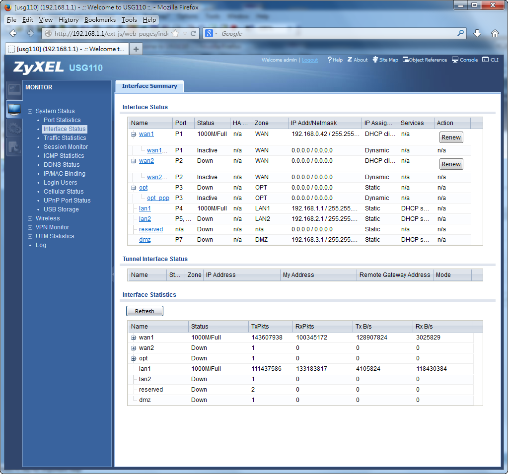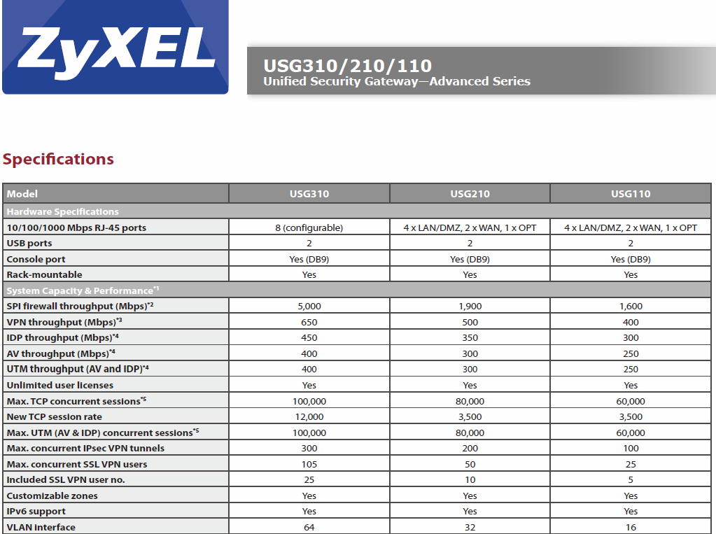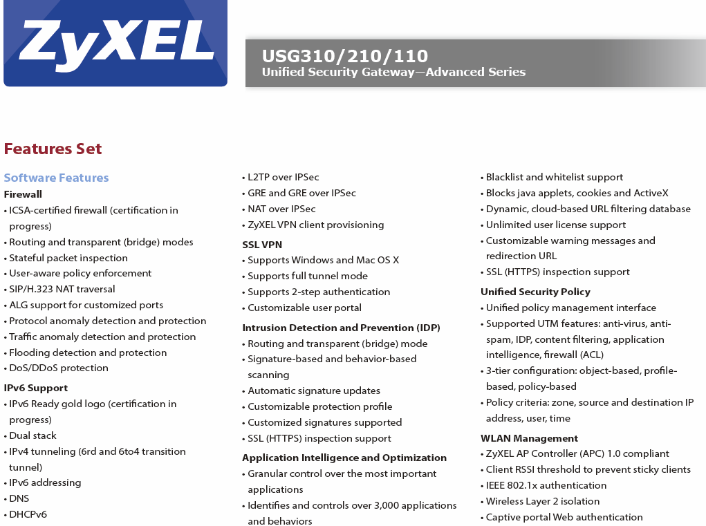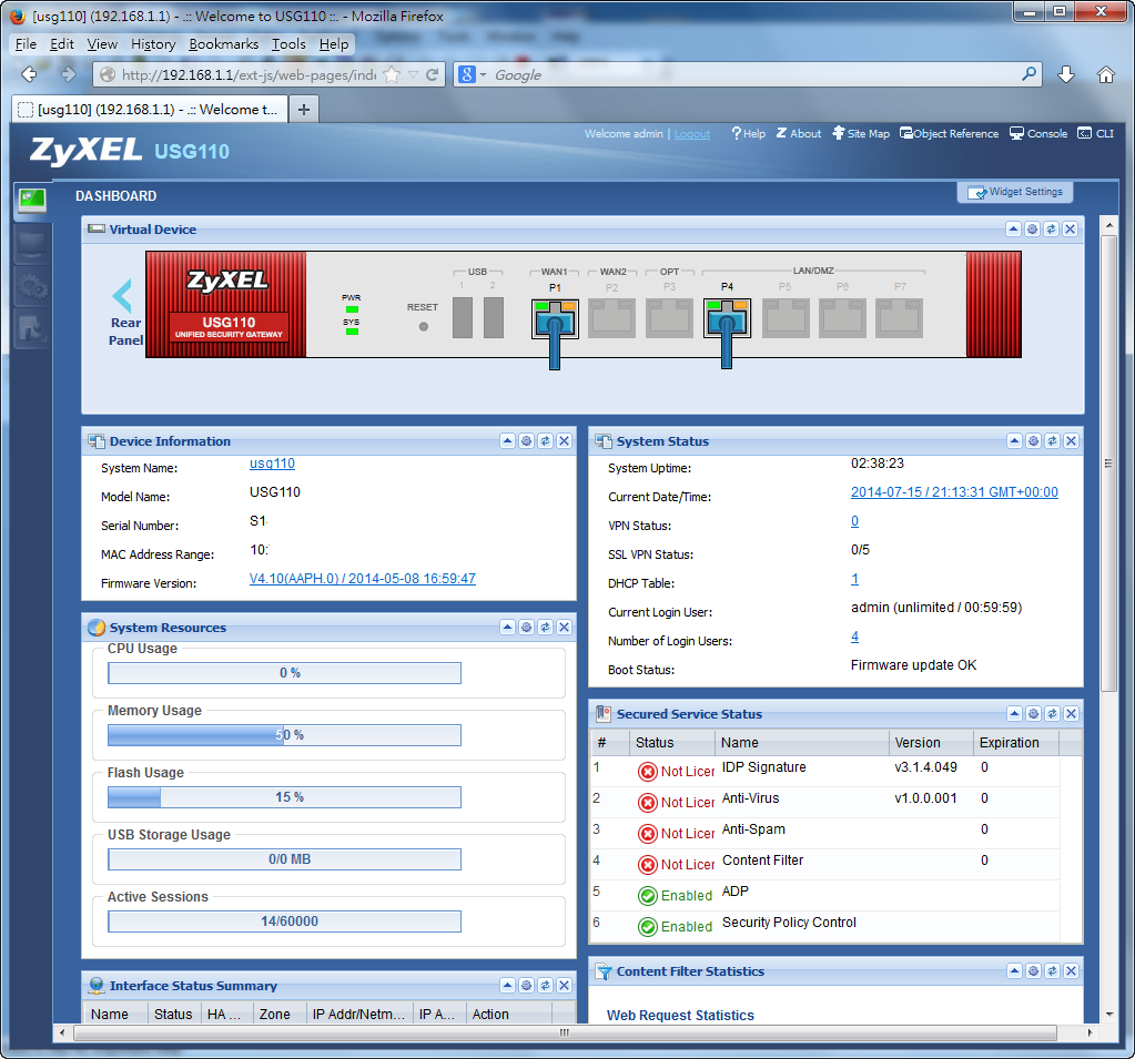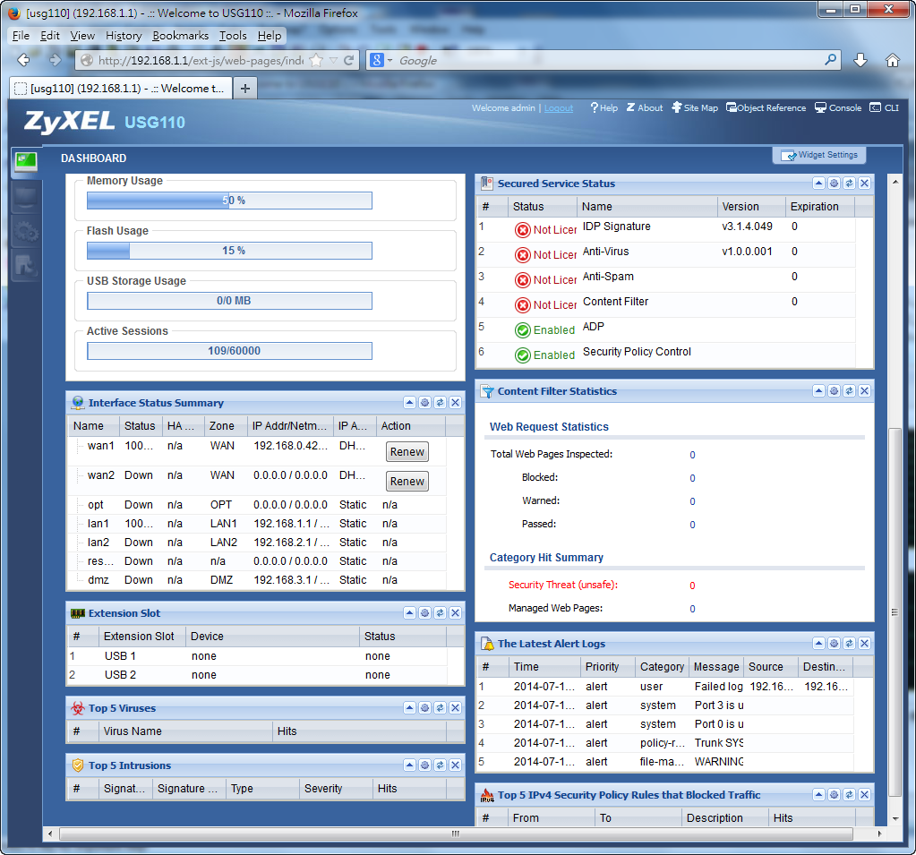 ZyWALL USG-110 以一顆 Cavium OCTEON II CN6230 4-Core 1.0GHz MIPS64 Communication Processor 為核心,再配以 Samsung 1GB DDR3-1333 RAM 及 Samsung 512MB SLC Flash Memory,網絡處理能力比上一代的USG產品提升了不少。USG-110 Unified Security Gateway 基本硬件規格及處理效能如下:- Cavium OCTEON II CN6230 4-Core 1.0GHz MIPS64 Communication Processor- 1GB DDR3-1333 RAM- 512MB SLC Flash Memory- 7 x GbE RJ-45, 2 x USB (multi-WAN & mobile broadband)- 1,600 Mbps Firewall throughput- 400 Mbps VPN throughput- 300 Mbps IDP throughput- 250 Mbps AV throughput- 250 Mbps UTM (AV and IDP) throughput- Max. TCP concurrent sessions: 60,000- New TCP session rate: 3,500 sessions/second- Max. concurrent IPsec VPN tunnels: 100- Max. concurrent SSL VPN users: 25 (5 user Included)- Support IPSec VPN and L2TP over IPSec VPN (DES, 3DES and AES 256)- Support SSL VPN (Windows 8.1 64bit and Mac OS X Full Tunnel Mode)- Support SSL (HTTPS) inspection- UTM support: Application Patrol, Content Filtering (CF), Intrusion Detection and Prevention (IDP), Anti-Virus (AV) and Anti-Spam (AS)USG-110 Web UI 內置多語言介面,當中包括英文、正體中文、簡體中文及德文等六種語言,可根據使用習慣選用適合自己的語言介面。進入USG-110後首先會看到一個DASHBOARD面板,在此可方便查看USG-110現時的工作狀態、CPU和RAM使用率、Sessions連接數量及各網絡端口的連接情況等。大家若對此Web UI感興趣的可到以下網址登入USG-110的online demo:https://demousg110.zyxel.com/User Name: demoPassword: demouser