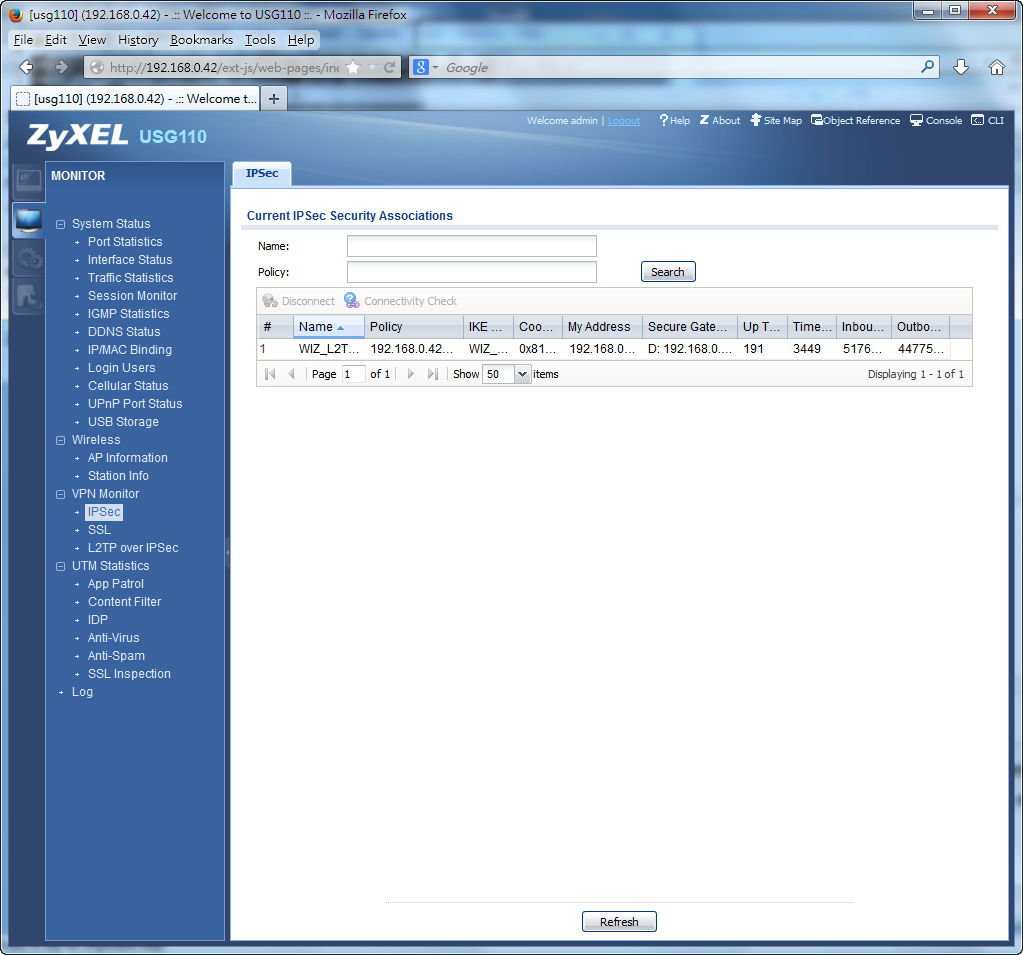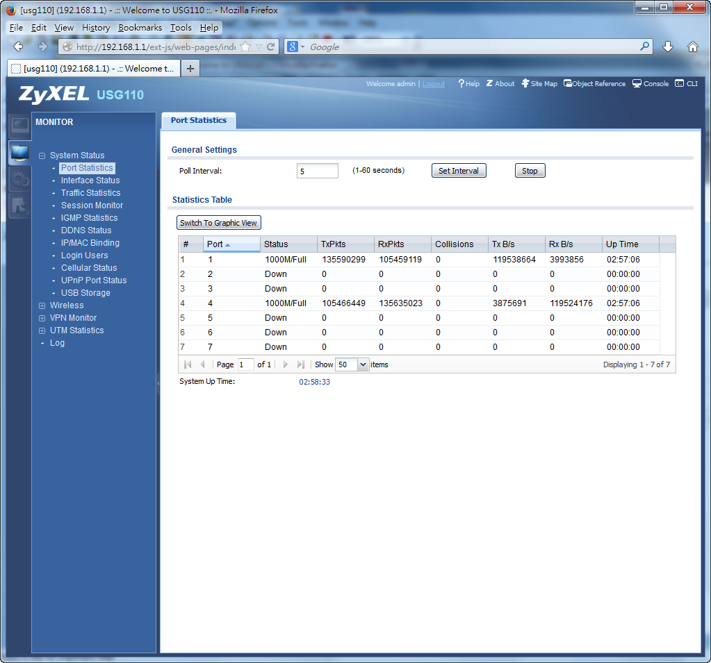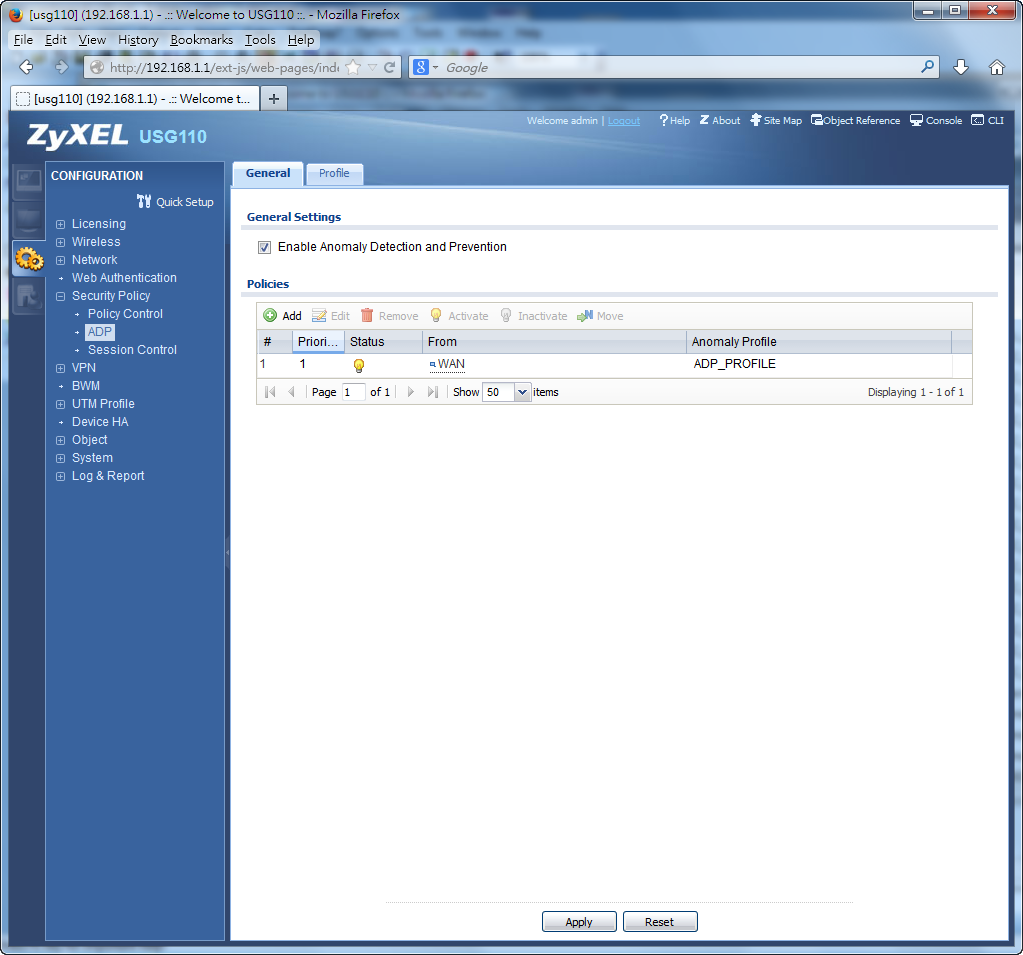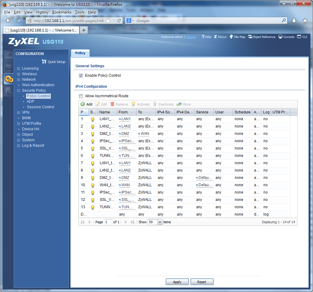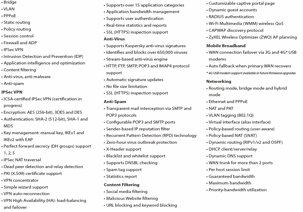 ZyWALL USG-110 以一顆 Cavium OCTEON II CN6230 4-Core 1.0GHz MIPS64 Communication Processor 為核心,再配以 Samsung 1GB DDR3-1333 RAM 及 Samsung 512MB SLC Flash Memory,網絡處理能力比上一代的USG產品提升了不少。USG-110 Unified Security Gateway 基本硬件規格及處理效能如下:- Cavium OCTEON II CN6230 4-Core 1.0GHz MIPS64 Communication Processor- 1GB DDR3-1333 RAM- 512MB SLC Flash Memory- 7 x GbE RJ-45, 2 x USB (multi-WAN & mobile broadband)- 1,600 Mbps Firewall throughput- 400 Mbps VPN throughput- 300 Mbps IDP throughput- 250 Mbps AV throughput- 250 Mbps UTM (AV and IDP) throughput- Max. TCP concurrent sessions: 60,000- New TCP session rate: 3,500 sessions/second- Max. concurrent IPsec VPN tunnels: 100- Max. concurrent SSL VPN users: 25 (5 user Included)- Support IPSec VPN and L2TP over IPSec VPN (DES, 3DES and AES 256)- Support SSL VPN (Windows 8.1 64bit and Mac OS X Full Tunnel Mode)- Support SSL (HTTPS) inspection- UTM support: Application Patrol, Content Filtering (CF), Intrusion Detection and Prevention (IDP), Anti-Virus (AV) and Anti-Spam (AS)USG-110 Web UI 內置多語言介面,當中包括英文、正體中文、簡體中文及德文等六種語言,可根據使用習慣選用適合自己的語言介面。進入USG-110後首先會看到一個DASHBOARD面板,在此可方便查看USG-110現時的工作狀態、CPU和RAM使用率、Sessions連接數量及各網絡端口的連接情況等。大家若對此Web UI感興趣的可到以下網址登入USG-110的online demo:https://demousg110.zyxel.com/User Name: demoPassword: demouser