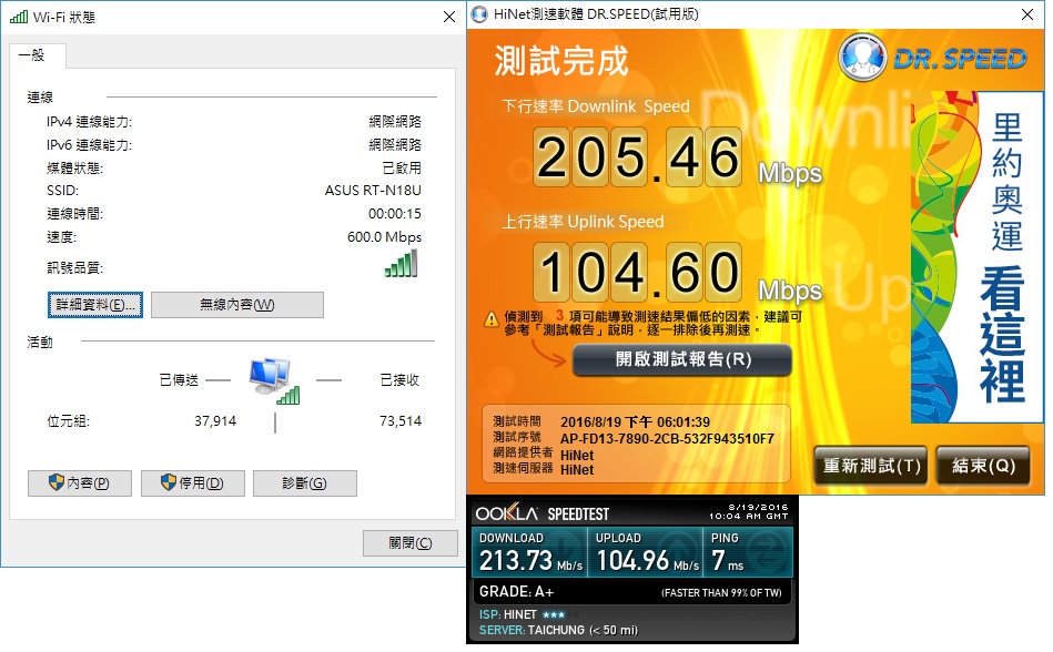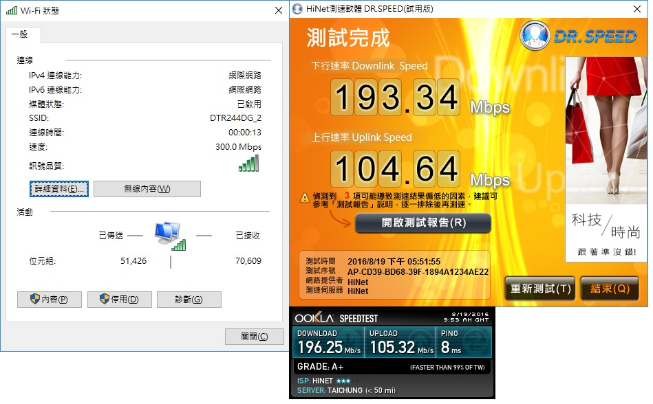記得用 Quick Setup 本身就會亮紅燈一陣子 當然一直亮著都不熄掉 那就是有異常勒...附加用 ASUS USB-AC68 連DTR-244DG 跟N18U的速度DTR-244DG 2.4GDTR-244DG 5GRT-N18U