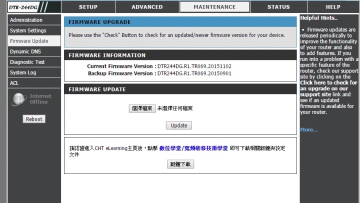 騎狗去撞車 wrote:請問這台更新韌體真...(恕刪) 不然你有看過中華電信這麼佛心,主動公布嗎?! 加上 這種東西 都在維護人員手上。只是剛好 我的又被操得怪怪的。報修128維護人員說 有新的韌體,經過我簡訊確認 是否為WIFI分享器 還是GPON。對方說是WIFI。我又問對方,目前版本認體 是2015年。有比這更新我有跟約中華電信 等我更新後。在看看,不然這裡沒圖沒真相。萬一更新出問題,中華電信... 怪我哩