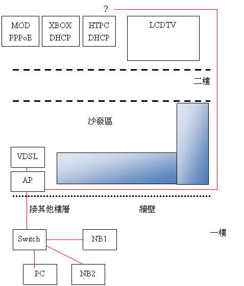 不過一開始的需求就是LCD TV和要上網的PC或NB在房間不同邊, 所以才有這些困難之處.另一種想法是, 把vDSL, MOD放在LCDTV旁, 並接一個wireless AP, 要上網的PC NB都靠無線上網如何?