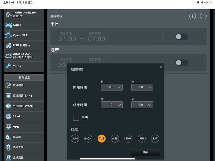 前提你家附近沒有其他免費網路,捷運、學校、醫院、商家、店家⋯⋯⋯⋯等等再來你家收得到訊號的鄰居網路密碼複雜或開mac過濾,不然有app可以破解還有無線分享器不能讓小孩知道在哪,不然就三道五道鎖起來現在新韌體沒有isp的帳號密碼也能自動設定,就是上面大大說的重置好幾年前的華碩 RT-AC86U啟動mac過濾,只允許加入的mac才能使用網路,改mac也沒用網站過濾功能,不能完全過濾,就聊勝於無時間安排設定,全戶斷網或依照選定mac設定管理時間安排設定