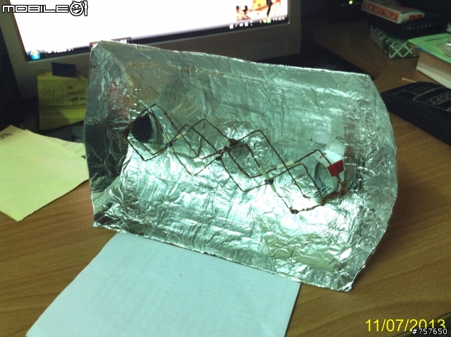 菱形天線後方以2~4層的鋁箔紙包覆著一捆銅線