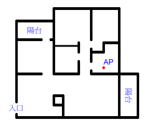 這個不太正常...我用的是 3com 3CRWE454G72 跟 intel 2200 BG,AP 放在紅點的地方。在房間門(木門)關上的狀態,全家(包括陽台)的訊號都是 54Mbps 最好,區網傳檔時也都有 2.4MB/s 左右,就算用 ASUS WL330 (位置也在紅點附近)在後陽台也是 11M bps 很好,試試看換一個頻道會不會改善,搞不好附近有人用一樣的頻道把你的 AP 蓋台。