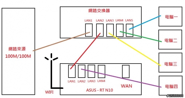 但發現第4台電腦長期下載東西會讓RT N10當掉,所以測試網路交換器直接接RT N10 (剩3台電腦+WIFI這樣)