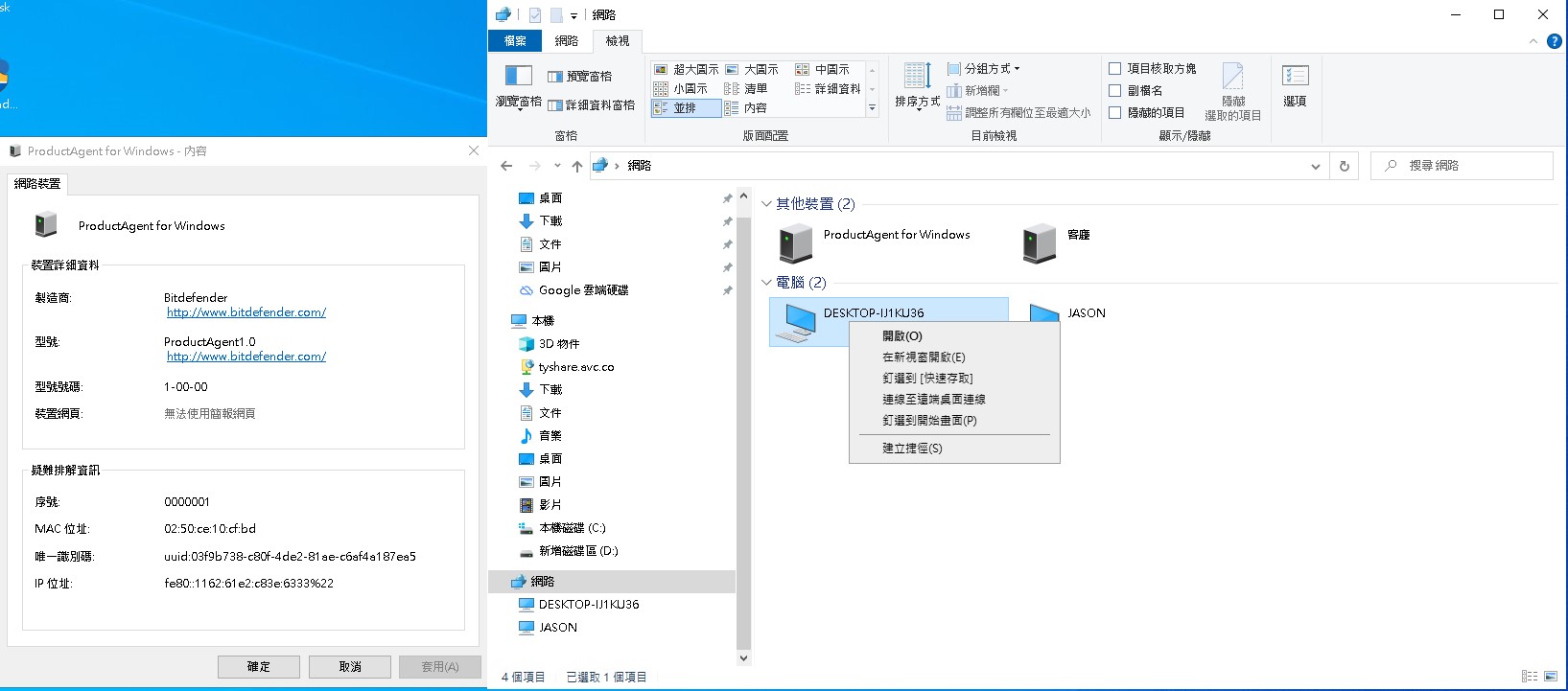 家中P880橋接接無線AP(負責硬撥、dhcp、wifi) 網路上芳鄰出現不明裝置兩枚 圖 bitdefender是曾經裝過的掃毒程式已刪除 不明白為何留有AGENT殘留 另外一台"DESKTOP-IJ1KU36"無法存取 確定所有電腦沒這個名稱 查了下DD-WRT裡的DHCP也沒這個裝置 圖 僅有一個"*"不明裝置 求助網通高手改如何處理這些不明裝置,謝謝各位
