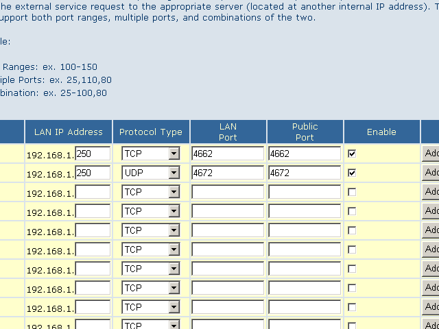 小弟原本單純使用adsl上網、玩bt、養驢子,之前只要在網際連線的進階設定裡,開放emule用的port,如:4662,就可以取得高的ID,但最近由於家中多了一台notebook要用無線網路,但adsl加上無線ap後,桌機用區域網路方式連進ap,但至此之後就都是低的ID了........原先開port的方式在區網找不到了,請問是要用何種方式才能解決呢?謝謝!