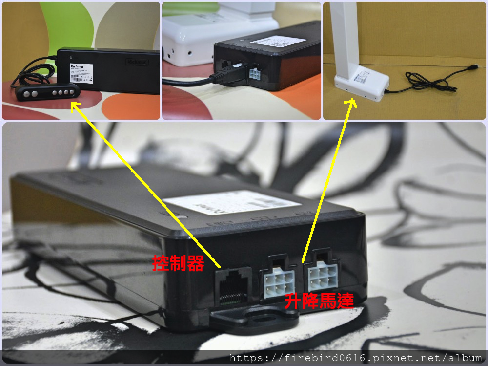 控制器是本產品的最大亮點,組裝過程卻相當簡單,與電源/操控面板/升降腳架的三種接頭都不相同,兩腳也沒有左右孔,不用擔心會接錯。