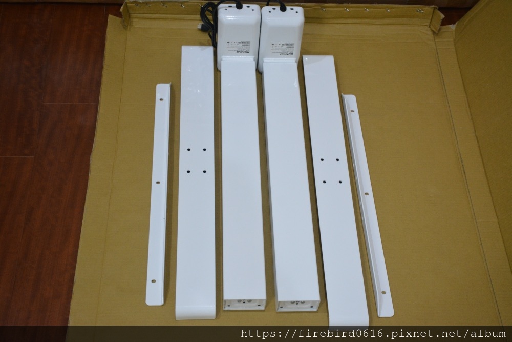 那箱零組件之所以會這麼沉重,主要是因為兩支升降腳柱,每支重達6.5kg。裡面的有強力的電動馬達,透過排線與控制盒連結後,就可以透過控制器進行操作。