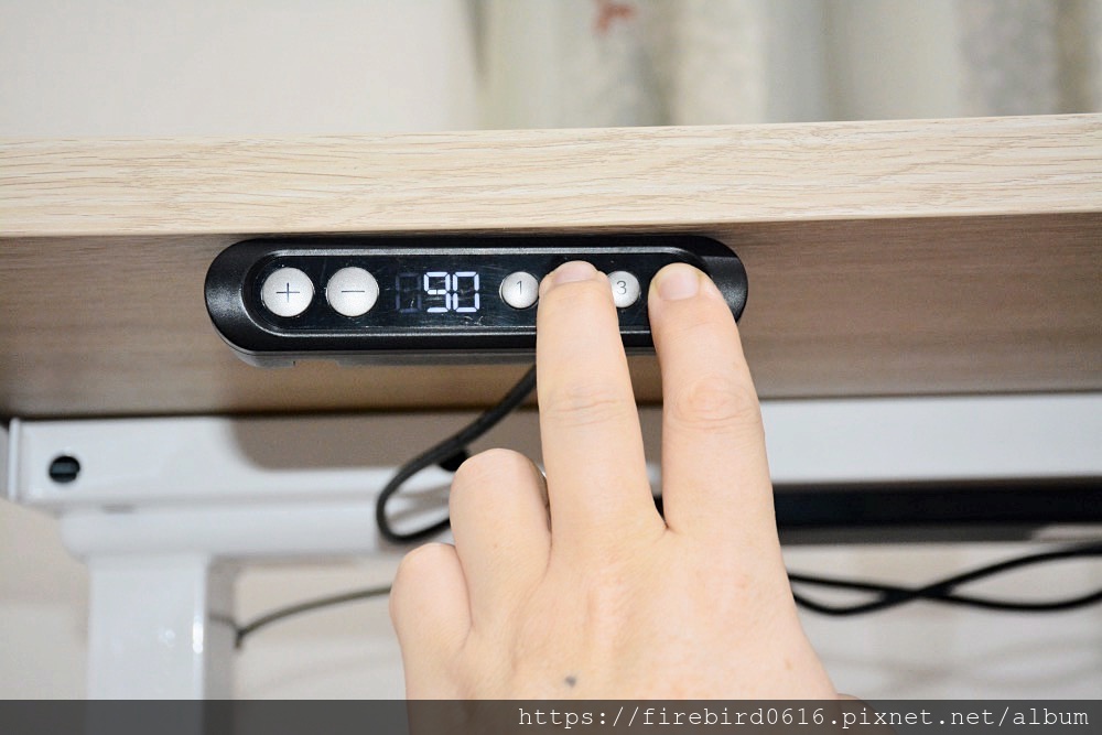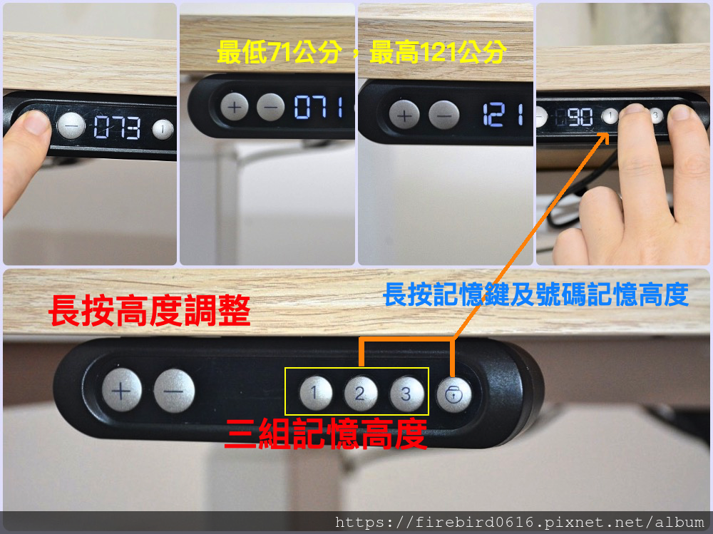 同時按住1/2/3任一個鍵,再按住最右邊的記憶鍵三秒,就會記憶目前的高度,之後使用不論在任何位置,只要按下這個數字鍵就會調整到對應的記憶高度。