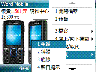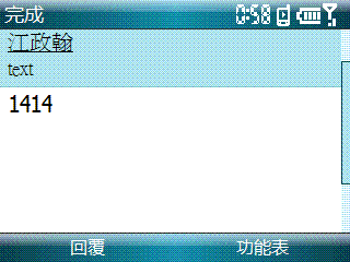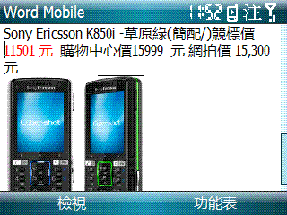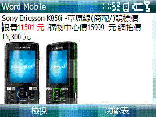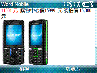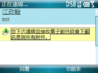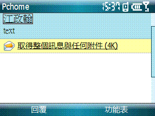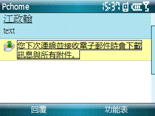 ESQ wrote:看到江董狂熱新的回答...(恕刪) 我又來回答拉!只不過不是很詳細,希望大大見諒1.來電顯示是否夠大張? 是幾x幾呢?(好小張喔)來電大頭貼我都只找到2003版的,WM6 QVGA還在找尋中,或是看有沒有其他大大能夠分享,內建的真的很小張2.Document-to-Go & mobile office, 真正最大的差異是在?我先放上mobile office『S730內建』的檔案來測試,Q9的晚點在PO上來『被我弟弟拿去用』BTW,我很少在用OFFICE,所以僅將檔案放置手機裡觀看,不是很專業,再請大大見諒這是EXCEL檔,可以和在PC一樣正常顯示『專業部分我就沒用到囉!只將內建功能弄上來』這是WORD檔,可以和在PC一樣正常顯示可以編輯文字這是POWERPOINT檔,也是可以正常『瀏覽』,不能編輯,要按下一步,就要按『SPACE』3.簡訊是否可以存檔於記憶卡 or SIM卡內?訊息來都是放手機記憶體,可以複製到SIM卡內4.是否有來電分組鈴聲?不行『也許是我找不到』5.使否可以安裝日文輸入進去?沒安裝過,不過我之前安裝其他輸入法,都有點問題,會嚴重LAG,所以後來就沒安裝6.明明沒有更動任何原廠設定, 再設定mail的時候 整個就都不會動一直顯示connecting... why@@?看一下解說好了,先在訊息中心裡面,選擇『新增電子郵件帳號』輸入你的MAIL帳號按下一步讓他去設定通常要30秒那是騙人的不到5秒就OK。完成囉!輸入名字輸入密碼再來就是『郵件設定』有很多時間讓你選擇,當然信件越多,用2小時『或是60分鐘以下』接收一次,信件就不會LOSE掉,不過相對的,電量也會減少。再來是進階設定裡面的選項再來還是按下一步,『郵件格式有HTML和文字檔可以選擇』『郵件下載限制,我都是選擇只有標頭,因為全下載有時檔案太大,只有標頭可以讓你先看標頭再選擇要不要下載整個郵件』之後按『完成』,系統就會自動連線登錄中接收一封新訊息『左上角有顯示』收到!!打開來看就是這樣子,因為只有選擇下載標頭,所以這邊會顯示『取得整個訊息與任何附件』按下去之後,會顯示按一下右下角的功能表,再來個『接收/傳送』他就會下載附件囉!希望有解決大大的問題『有些小弟還是沒辦法拉!!』