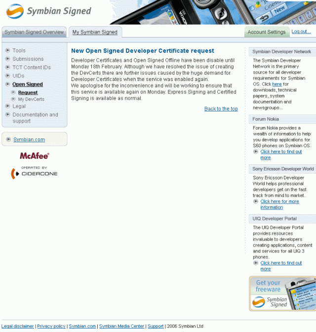 自從購入 N82 幾乎隨時都在關注 SymbianSigned.com 的狀況,它們從 14 號開始就關閉了簽證製作功能,至今仍未恢復(剛才公佈說延到 18 日),實在是相當困擾(想裝的程式都需要自簽)。