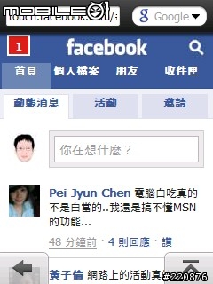 dkiller94 wrote:剛剛有稍微爬一下文可...(恕刪) Touch 3G應該沒內建Marketplace你可以試試看用手機開啟瀏覽器輸入網址mp.windowsphone.com安裝Marketplace之後開啟登入你的MSN帳號就可以下載Facebook for wm手機的應用程式就可以在手機上使用Facebook了這隻手機似乎也沒有辦法使用WiFi可能要先確認一下你上網費率以免帳單爆炸以上都是剛剛幫你查找所得的資料若有誤請自行修正