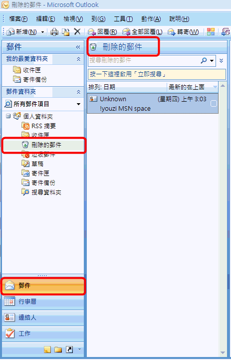 hpir416v wrote:大大請問刪除的資料夾在哪邊??我電腦找不到選項 開啟【Outlook】(不是windows內建的Outlook Express)在【收件夾】的下面有個【刪除的郵件】,被刪除的聯絡人應該都在裡面。