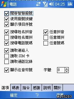 hsiangyang wrote:我想你的問題可能跟我...(恕刪) 這套軟體太好用了,管它英文、中文、中英文合併的名稱,都可以任挑其中一關鍵字找出來!以「C幸福家俱」為例來說:輸入282找"C幸"(英文字母C + 注音[希]和[一]註:因本站禁用注音發言,故以國字替代)即得直接輸入82找"幸"(注音[希]和[一])即得甚至28找"C幸"(英文字母C + 注音[希])在第六項也得不然找"福"輸入1(注音[夫])也得再不然找"傢"輸入221(注音[基]一[阿])也是最後找"俱"輸入28(按鍵和"C幸一樣,注音[基][玉])也是得習慣使用英文及注音搜尋的前輩們,要達到以上效果只需將celedialer選項設定為另外碼表勾選注音符號祝好運!!不要忘了關掉smartdialing喔(會擋住畫面)註:使用機器818pro再次感謝開發、張貼本軟體的前輩,謝謝!(微軟取個經吧,呵呵)