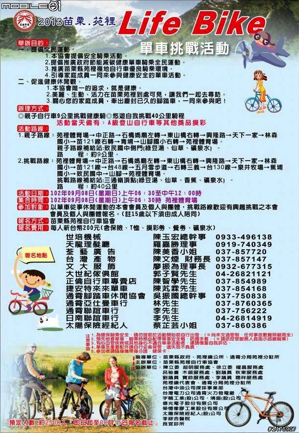 08/01 2015滿天星系列 土星-KHS詩情畫意羅馬公路08/02 2015拜訪新開08/02 2015年領先盃自行車陽金公路友誼賽活動08/02 2015新竹縣破風盃單車自我挑戰賽(延至8/2)08/02 魅Liv郊遊 淡水左岸單車逍遙遊08/08 環北台灣200K單車挑戰08/09 2015經典台灣越野單車之旅-新北鶯歌桃源山08/09 魅Liv騎跡 台中萬里長城女子挑戰活動08/15 華江濕地候鳥生態鐵馬遊08/15 第7屆武嶺盃「鐵馬高峰會」國際自行車大賽08/22 2015 彰化大佛盃追風挑戰賽08/22 東北角山海隧道鐵馬懷古遊08/22 2015竹南騎跡 5騎5保庇08/22 2015騎鐵馬遊「客」風情08/23 2015太麻里金針山自行車登山賽08/23 康芙麗欣騎天08/30 2015 第二屆宇能盃車友聯誼活動08/30 2015TWB單車嘉年華-台中場9月09/05 淡海灣自然生態鐵馬觀海遊09/06 高雄市鳳山區單車快樂遊-道卡斯雙湖連騎09/06 2015環曾文水庫自行車自我挑戰09/12 2015 永不放棄 挑戰巔峰-武嶺09/13 【拼!環島】第三階段百K 高雄-旗山09/13 越野欣騎天09/13 2015經典台灣越野單車之旅-彰化社頭清水岩09/13 2015 拜訪日月潭09/19~21,The Devil Menu 魔鬼菜單09/19~20 2015捷安特盃自行車嘉年華09/19 2015 西濱109追風挑戰賽09/20 台中不落309/20 環大台北自行車挑戰09/20 五府千歲平安祭2015BoBi騎09/26 2015洄瀾國際單車豐年節10月10/03 2015俱樂部聯賽-玉山塔塔加登山賽10/03 超級欣騎天-2015秋巡雙溪10/04 2015土城扶輪節能盃自行車自我挑戰賽10/09~11 2015 拜訪金門+廈門10/11 2015TWB單車嘉年華-新竹場10/17 雙北公路200公里騎乘認證10/17~18 2015雙武爭鋒挑戰賽10/18 【拼!環島】第三階段200K 高雄-東源10/24~25 2015 永不放棄極限挑戰 400K/200K10/24~25 2015道卡斯-瑪吉斯盃城市下坡賽10/24 2015八卦山脈美利達盃&單車嘉年華10/30 2015臺灣自行車登山王挑戰10/31~11/01 2015 雙鐵挑戰拉拉山10/31 2015 北高認證10/31~11/01 2015 双塔認證11月11/04~11/08 Audax Taiwan 1100公里鐵屁股之役11/07 2015Garmin & Mobile01西拉雅100K11/08 2015 鹿場 苗栗新中橫11/08~11/09 【拼!環島】台北-高雄11/08 2015杉林溪自行車挑戰賽11/14 2015 台北市中正盃11/14~11/22 2015騎遇福爾摩沙11/1 嘉南新不落11711/15 2015日月潭comebike day11/15 2015滿天星系列 太陽-環日月潭&潭南部落11/15 2015經典台灣越野單車之旅-南投武界11/15 2015恆春半島落山風單車挑戰暨休閒騎11/21 太平洋欣騎天11/22 2015TWB單車嘉年華-台南場11/28 北高380極限認證12月12/06 2015 永不放棄 挑戰陽金P字山道12/11~13 2015經典台灣越野單車之旅-新竹司馬庫斯12/12~13 2015 花屏320K12/19 欣騎天12/19 2015臺南購物節大新營嘉年華 樂活單車遊