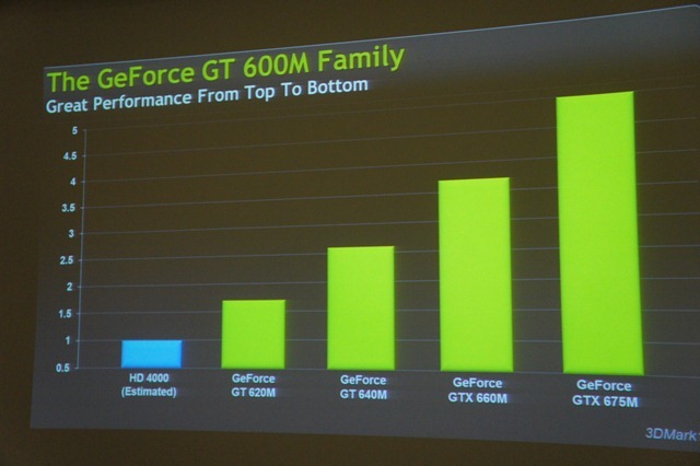 根據3DMark軟體測試結果,Geforce 600M家族效能與Intel HD4000相比,最高有五倍的差異(GTX 675M)。