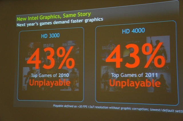 Intel CPU的內顯,不論是2010年的HD3000,或是2011年的HD4000,對當年度頂尖遊戲來說,都只有43%的比例,能在使用Intel CPU內顯環境下來玩。
