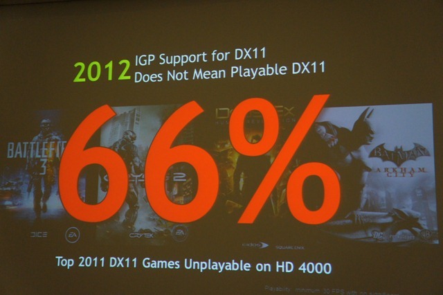 雖然內顯在2012會支援DX11,但以Intel HD4000為例,2011年使用DX11技術的頂尖遊戲,還是高達66%的比例,無法在HD4000下面玩。