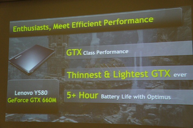 以搭載Gefore GTX 660M的Lenove Y580 Gaming筆電來說,除了做到最輕、最薄,在Optimus省電技術搭配下,Y580在使用電池電力下,還能使用超過五小時以上。