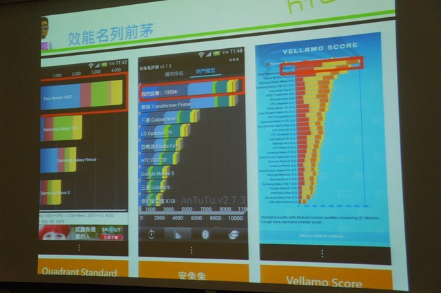 由於高檔的硬體規格,所以在Quadrant Standard、安兔兔、Vellamo Score三套測試軟體測出來的效能,都是排在最前面的。