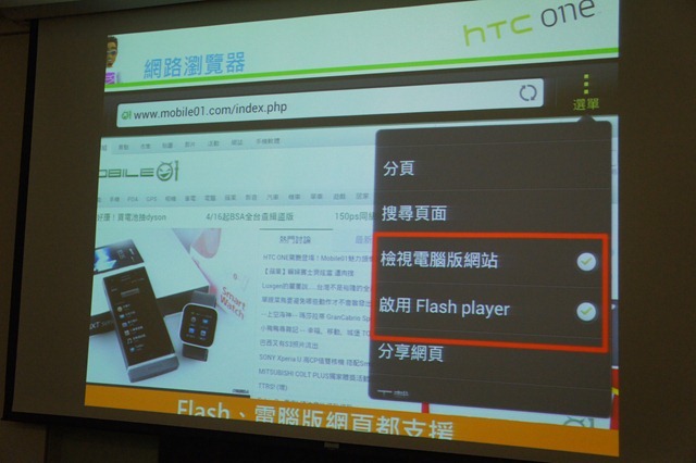 HTC One X內建的瀏覽器,可以設定要瀏覽的是電腦版網站,以及是否要啟動Flash player,使得在瀏覽網頁時,能有最大的瀏覽彈性。