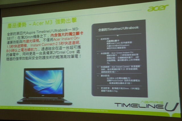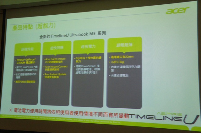 首先介紹的,是更輕、更薄、更長效的Acer TimelineU Ultrabook M3。