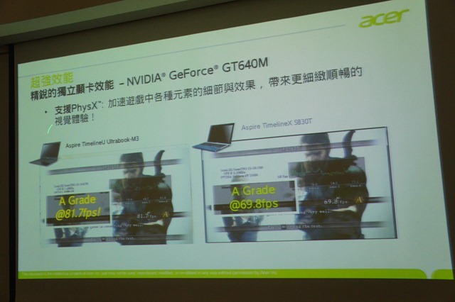 Geforce GT640M支援PhysX技術,以相同遊戲測試,Acer M3測試出來的數據為每秒81.7張,與前一代機種相比,每秒多了12張。