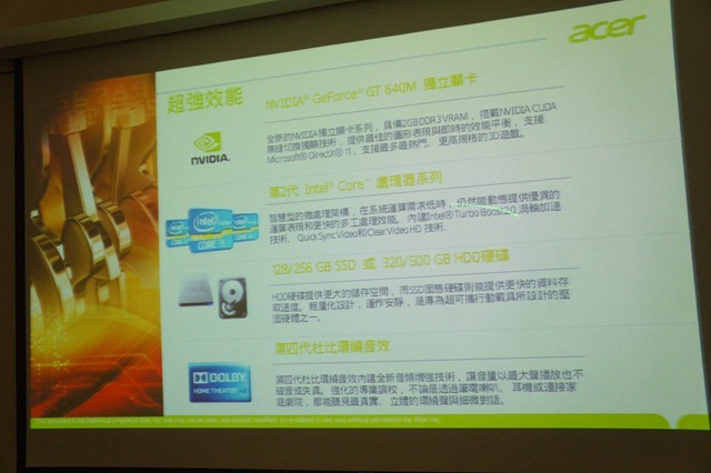 Acer M3超強效能的原因:使用Geforce GT 640M獨立顯卡、第二代Intel Core處理器、SSD或大容量硬碟,並搭配了第四代的杜比環繞音效。