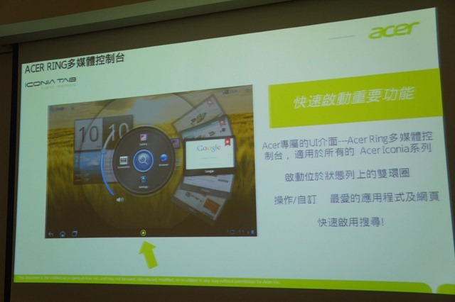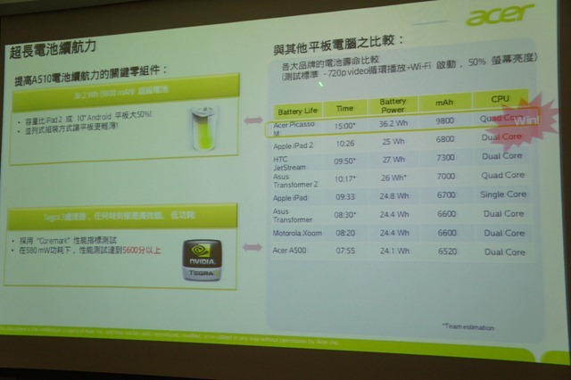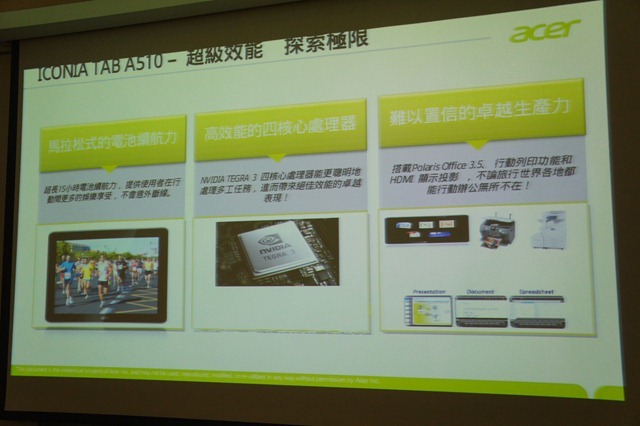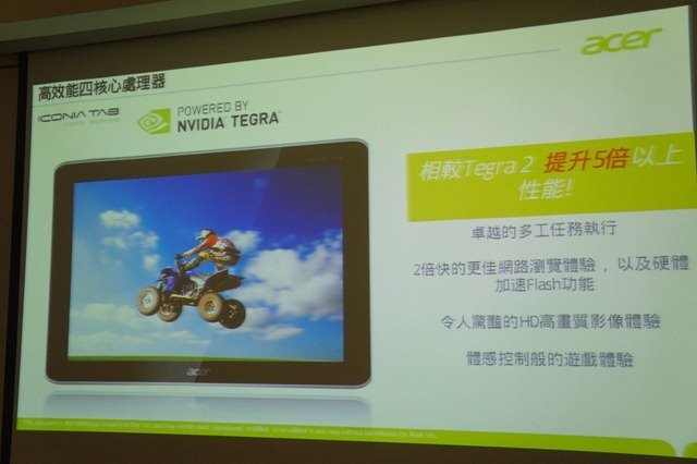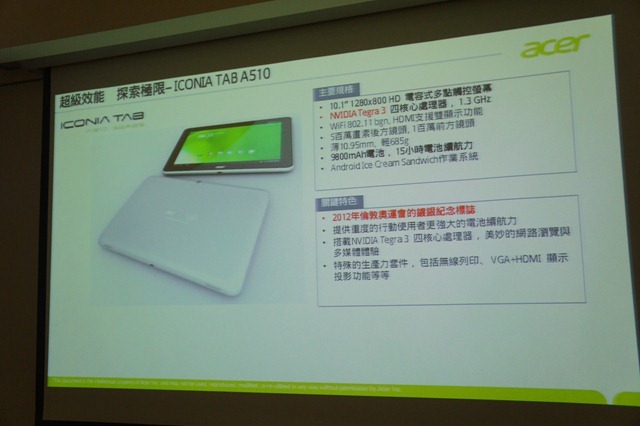 介紹完Acer M3,劉副理接著介紹,使用四核心Tegra 3處理器的ICONIA TAB A510平板電腦。