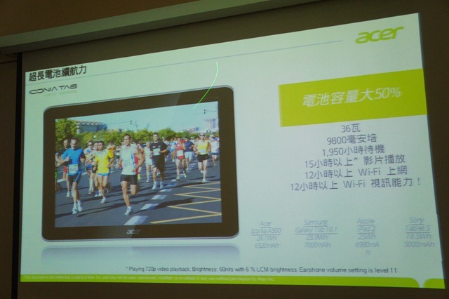 在不影響輕薄狀況下,ICONIA TAB A510有著高達9800 mAh的電池,並在高效能、低功耗的Tegra 3處理器加持下,續航力與其它廠牌主力機型相比,最少都有四個半小時以上差距。