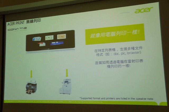 以Acer Print無線列印來說,只要印表機有支援,就可以將A510內的文件,無線輸出至印表機列印。