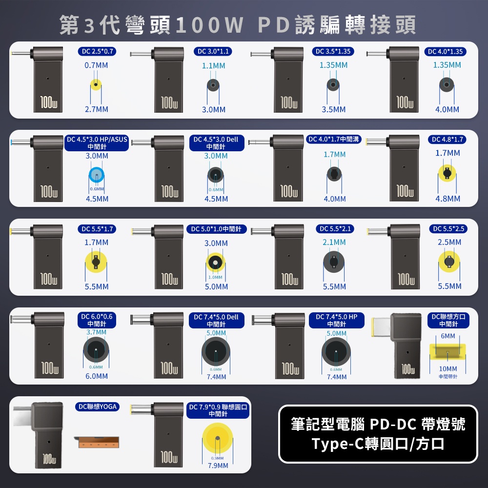 個人所知若多台功率不同筆電比方45W、60W、65W..都支援PD,只要一個大功率充電頭如65W、或以上如80、100W即適用每台筆電、且不傷機子和電池。