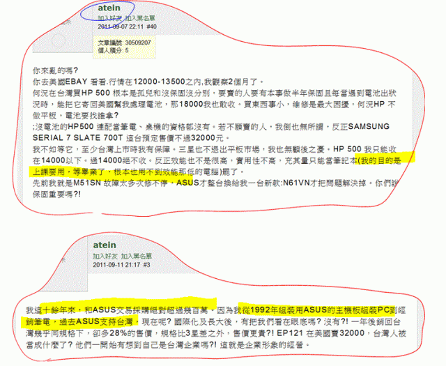 我這十餘年來,和ASUS交易採購絕對超過幾百萬。因為我從1992年組裝用ASUS的主機板組裝PC到經銷筆電,過去ASUS支持台灣,現在呢? 國際化及長大後,有把我們看在眼底嗎? 沒有?! 一年後銷回台灣幾乎同規格下,卻多28%的售價,規格比3星差之外,售價更貴?! EP121 在美國賣32000,台灣人被當成什麼了? 他們一開始有想到自己是台灣企業嗎?! 這就是企業形象的經營。