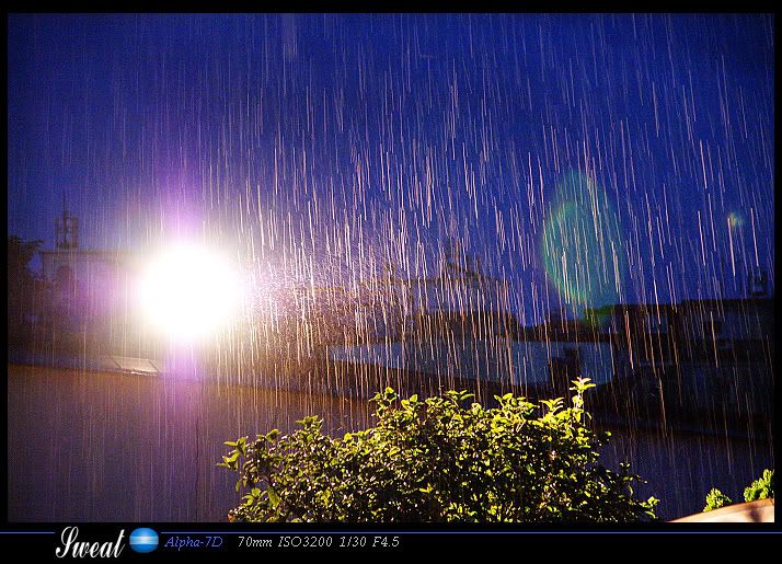 這是之前台南梅雨季大雷雨的時候衝出去拍的,只有在雨很大的時候,才比較有可能拍的出雨滴,不棄嫌看看吧。
