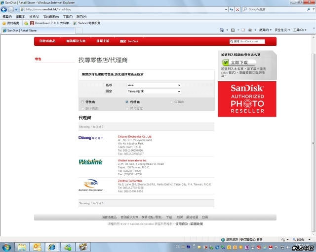 Sandisk官網上的代理商的確是寫增你強(Zenitron Corporation)、展碁(Weblink International Inc.)及群光(Chicony Electronics Co., Ltd.)增你強的記憶卡及隨身碟已經買過好多次了。群光的有在購物網站買過SDHC卡,光華及NOVA沒看過有店家賣。價錢比增你強便宜,保固不知道做得怎麼樣。展碁的還沒有看過網路及實體店家有賣。