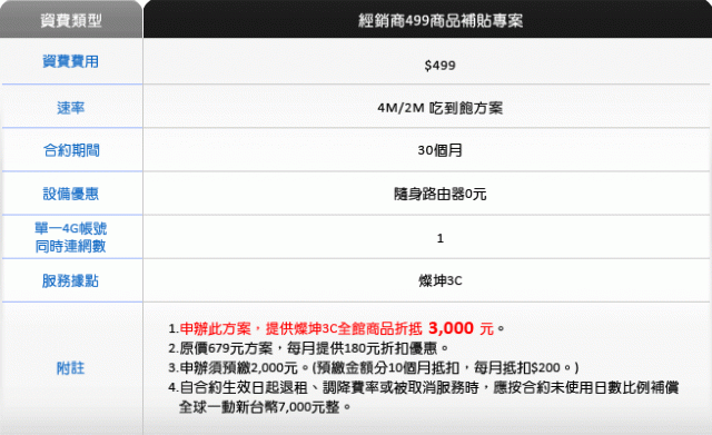 stargroup wrote:http://www...(恕刪) 剛剛問了 只限 燦坤燦坤可使用3000禮金押金2000分10個月 抵銷 前10帳單(679-180)=499 -200第11到30 恢復499大力玩 就1元感覺 這各比門市 配手機0900 划算