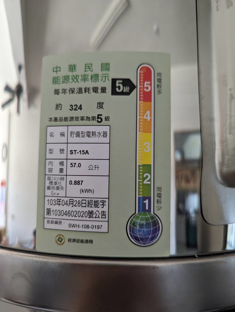 耗電統計: 有裝獨立電表,自100/09/11統計至113/03/24共4578天(約12.5年),7年前女兒陸續到外地就學,每日平均耗電由3.3度/日降至目前的2.8度/日,4年前開始不設定時,水溫降至下限即自動加熱。