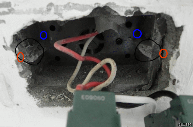 斷耳螺絲不是很好買,且一組要30元以上,其實也有不花錢的方法,1. 把螺絲鎖進下圖紅圈塑膠殼與水泥的接縫處。<---什麼都不需要,但左側的水泥要敲掉一點,看到接縫2. 塑膠破裂處,用AB膠黏水泥補起來,重新攻牙。<--在AB膠在快硬化前鎖出個孔,退出來,等全硬時再鎖3. 用長一點的螺絲,鎖進下圖藍圈底部。<--可能要電鑽+2支較長的螺絲+塑膠塞子(壁虎)也可以用原本就有的孔,但可能角度會偏掉太多,孔太大! 要特別注意不能鑽或鎖到電線!